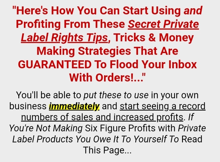 You don't have to be stuck at the bottom of the marketing ladder forever.Why? And more importantly How?... actually, it's quite simple.the answer lies in private label rights.you see, unlike any other method of product creation private label rights gives you the means with wich you can generate potential best-sellers in a matter of hours. it's really a great way for the "little guy"to get a big jump on the competition. ofcourse you can't just "scroll down the road"and expect to make an impact. You need to be different.you need to stand out from the crowd.And,until now, you needed some really good imagination to pull it all off.Not anymore-you can learn all my insider tips,tricks and strategies for taking"dime-a-dozen" private label rights products and turn them into potential best sellers.